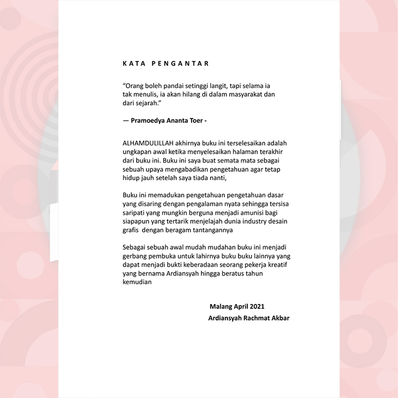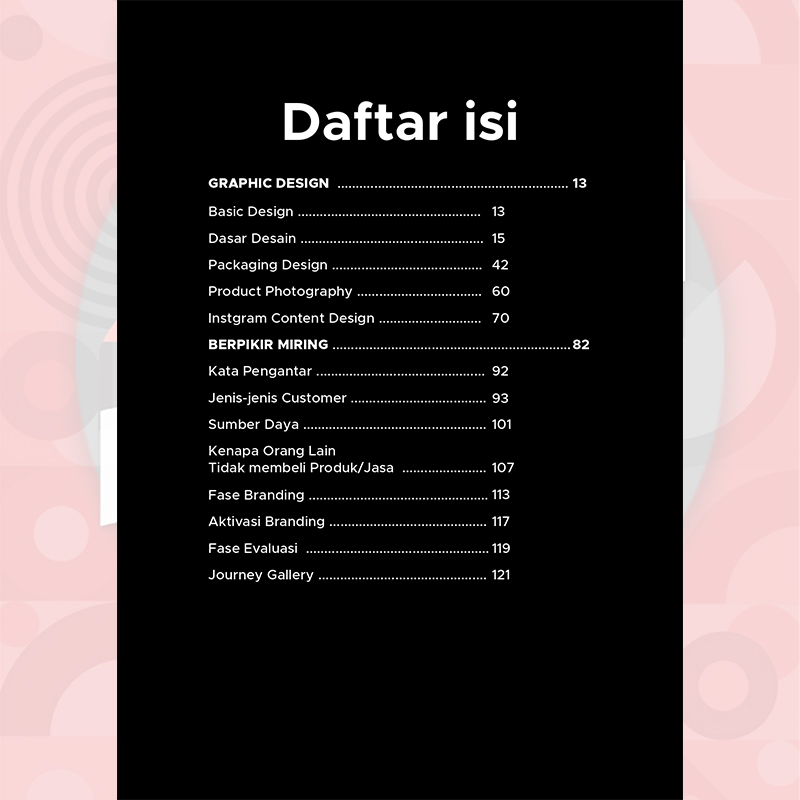Ebook Doseen Desoon ini didedikasikan untuk para pembelajar kreatif sejati di luar sana yang selalu mencari cara untuk menjadi hidup melalui rasa keingintahuannya, seperti yang tertulis pada halaman pembuka. Ebook ini mengajak pembaca untuk “berpikir miring”—melihat dunia desain dan bisnis dari sudut pandang yang tidak biasa.