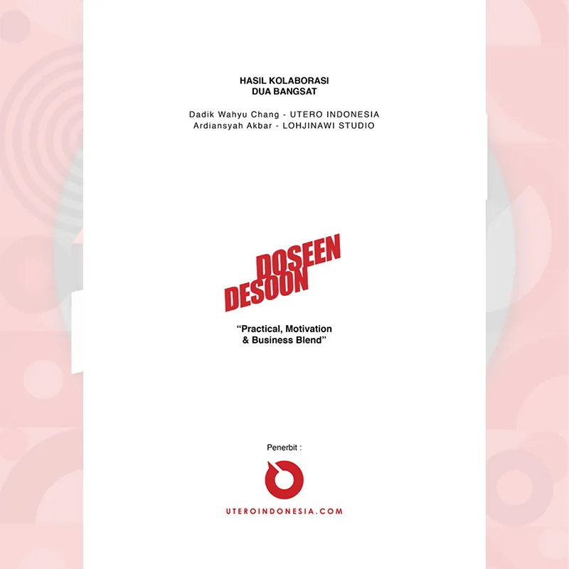 Doseen Desoon: Graphic Design Practical Handbook Berpikir Miring adalah sebuah ebook kolaborasi inspiratif antara Dadik Wahyu Chang, pendiri UTERO Indonesia, dan Ardiansyah R Akbar dari Lohjinawi Studio. Dengan total 126 halaman, ebook ini merupakan panduan praktis yang menggabungkan elemen desain grafis, motivasi, dan strategi bisnis kreatif, sebagaimana tercermin dalam tagline-nya: “Practical, Motivation & Business Blend.”