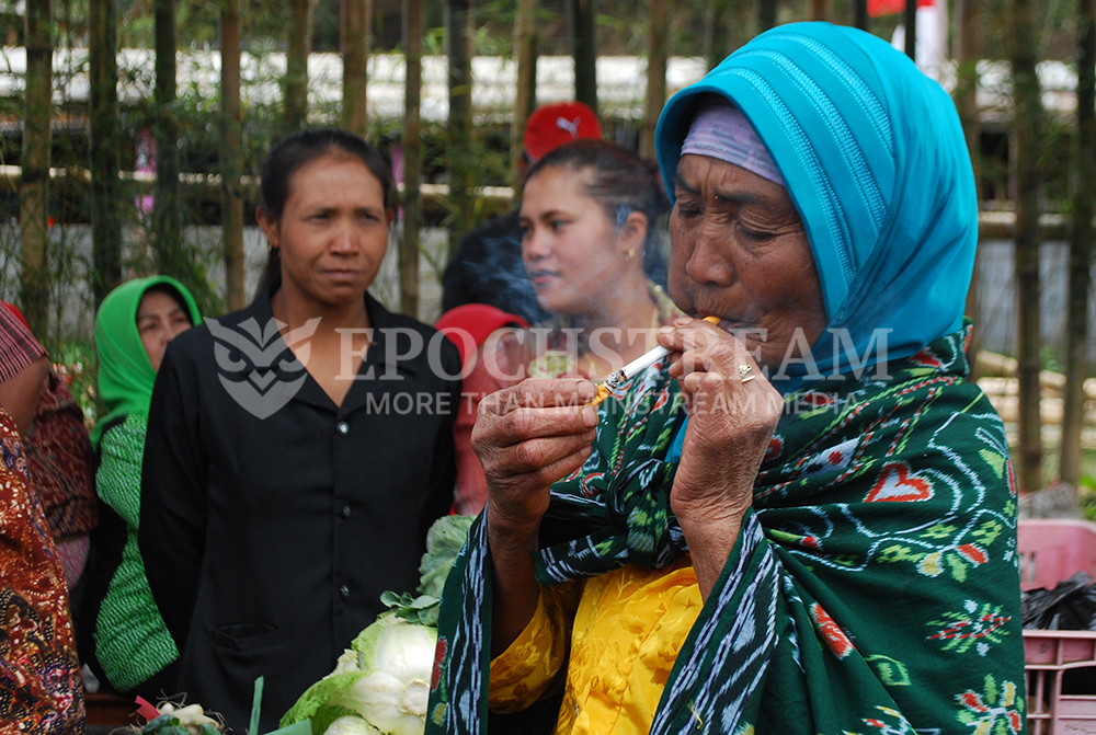 Subjek utama, seorang ibu dengan kerudung biru terang yang menawan dan kain motif hijau tua, difokuskan dalam aksi pribadinya yang santai: merokok. Ekspresi wajah yang tenang dan terpejam saat menghisap rokok memberikan kesan kontras yang mendalam—sebuah momen istirahat pribadi usai khidmatnya upacara adat.
